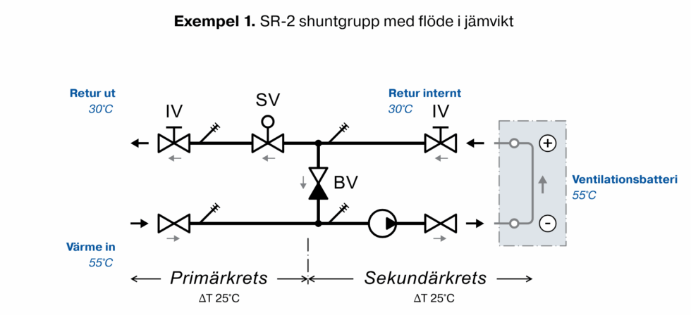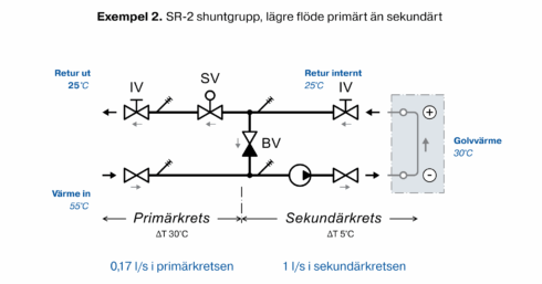 Exempel 2: En SR-2 shuntgrupp kopplad till golvvärmen i ett hotell. Vatten kommer in på primärsidan som 55° och blandas ned till 30°. Returen från golvvärmen är 25°. För att få 30° igen ut till golvvärmen släpps en mängd 55° vatten in i systemet. Temperaturskillnaden på sekundärsidan är 5°. På primärsidan är skillnaden 30°. Det innebär att det är mycket lägre flöde primärt än sekundärt. Styrventilen dimensioneras för det mindre flödet på primärsidan.